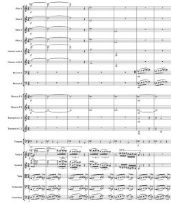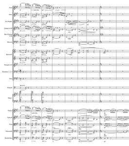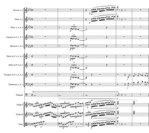 In the upper strings there are extremely high E-flats supported by the divided second violins. The entire lower string section has an E-flat–A up and down run in each measure as an ostinato. As the passage progresses the high E-flat chromatically runs down to the A, occurring in the following measure. Finally, the first violins play the sixteenth note E-flats, slowing to the sul G passage in broad sixteenth notes.