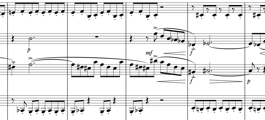 Except for the eighth note pattern in the flute and clarinet, there’s nothing screaming out, “Look at me. I sound just like Stravinsky’s Rite of Spring.” However, upon closer inspection, there are elements that deserve further consideration and these might justify such a claim. Listen to the string pizzicatos produced by the violas and cellos, triple stopped. Notice that the top note of each sections’ chords rest between G-sharp and E, a descending major third. The Stravinsky alternated between a descending minor third and a descending perfect fourth. So, here the Bartók is sitting right in between the two notes with a major third. Of course, these are (dissonant) chords whereas the Stravinsky pizzicato notes are solos. Nevertheless, with the addition of the staccato winds we hear a very similar sound.