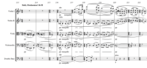 This is from late in the piece. The lower strings have a reprise of the descending block chords for a few measures. Following this is the entrance of the part that had been highlighted by Orchestra II, but is now played by all the strings except the first violins. At the entrance of the ensemble in measure 216, the activity is in the middle strings (second violins, violas and cellos). They have the rhythmic passage. It’s the basses and first violins that enter sustaining a G. But note that only half of the first violins enter on one line G. They are joined in the next measure by the other half, playing two line G. Then, on the last millisecond of the measure, both halves of the section jump an octave as an appoggiatura, entering on the downbeat of measure 218. The effect is to sneak them in to the activity in the remainder of the strings and, now that they are established with the top in three line territory, they take over the melodic line.