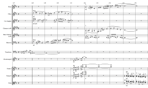 To enhance the clarity of this acceleration of notes, the oboes and clarinets start with eighth notes and move to eighth note triplets in their higher registers as the flute section moves into the stratosphere. The other section that has a similar pattern is the upper strings. The first violins play sextuplets sul ponticello, joined by the violas and occasionally by portions of the second violins and cellos. Playing near the bridge (sul ponticello) creates a more “metallic” – also described as “nasal” – sound. This adds to the tension created during this six measure crescendo.
