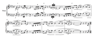It’s notable that, after that first measure establishes the rhythmic tone of the movement, the left hand has four more bars of sixteenth note chords. Mussorgsky plays with the single tone drop  in the sixteenth note figures in bar number three. But after the second measure is repeated in measure four, the piano part returns to again focus on the four-sixteenth note groupings. In this case, four that are staccato and four that are slurred. Also note the quarter notes on the down beats. When we arrive at measure six the alternating lines between first the left and then the right hands are an element that the orchestrator employs to highlight, adding more color to the mix.