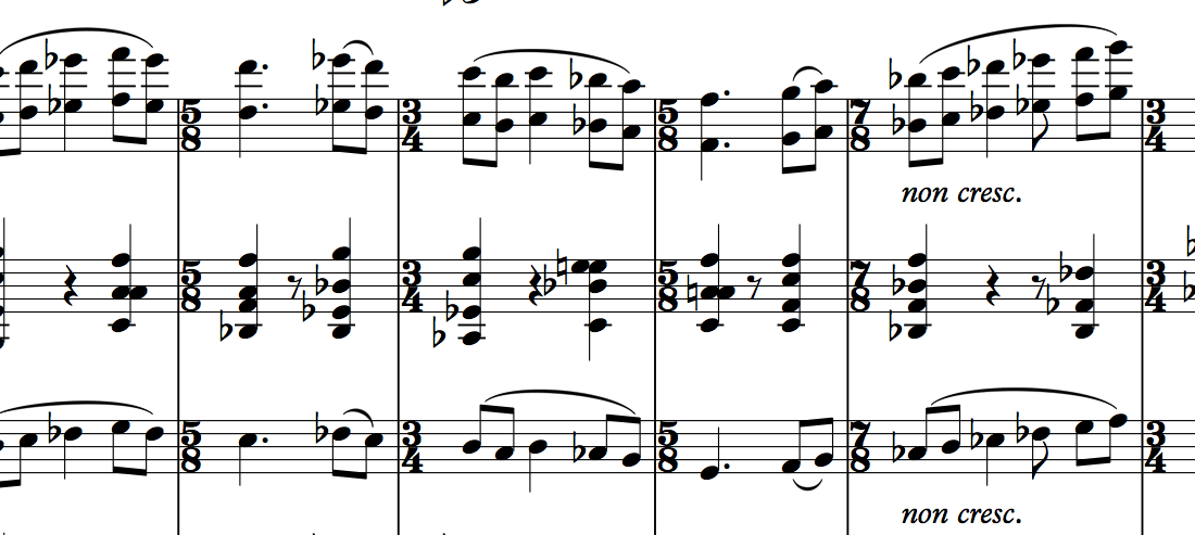 The fourth movement of Béla Bartók’s Concerto for Orchestra has the subtitle Intermezzo interrotto (“Interrupted Intermezzo”) and the piece lives up to its title. With one listen it’s easy to hear both the basic melodies with their irregular tempos and as well as the lively and regular march-like melodies with which it is interrupted.