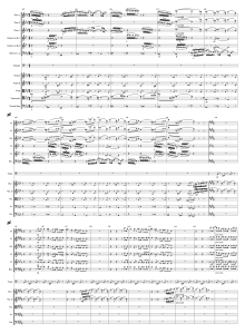 Before continuing, please note that the score is in concert pitch. That is, it is not transposed. For those of you used to reading scores this can be a little disconcerting. And while I’m on the subject of caveats: There is a mistake in the score in the line simply called Bass Trombone. It should be notated as Trombone III and Tuba. Also, in my previous post (number 48) I listed the first six overtones of Great C incorrectly. The sixth overtone is not two-line C, it should be one-line B-flat. The seventh overtone is two-line C. Mea culpa.