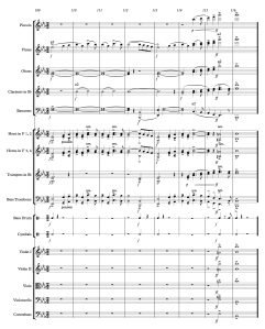 Before leaving this example, I’d like to call your attention to a small touch that contributes its own type of richness. It may be difficult to perceive upon the first hearing, but try to listen for the two clarinets – in thirds, of course! – in measures 128 and 131, the two measures wherein the flutes and oboes have the descending quarter note-eighth note thirds. The passage calls for the clarinets to enter on the third eighth note of the first beat and sustain one third for the second beat, returning to the opening third on the third beat. I suggest that you listen for this in light of the implied chord changes in the flute and oboe lines. When you learn to hear this passage and appreciate how much it contributes to an otherwise transparent orchestration, you’ll have a new appreciation for the simple yet luxurious effect two clarinets in their chalumeau register can contribute.