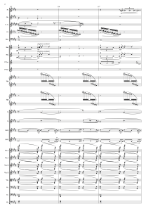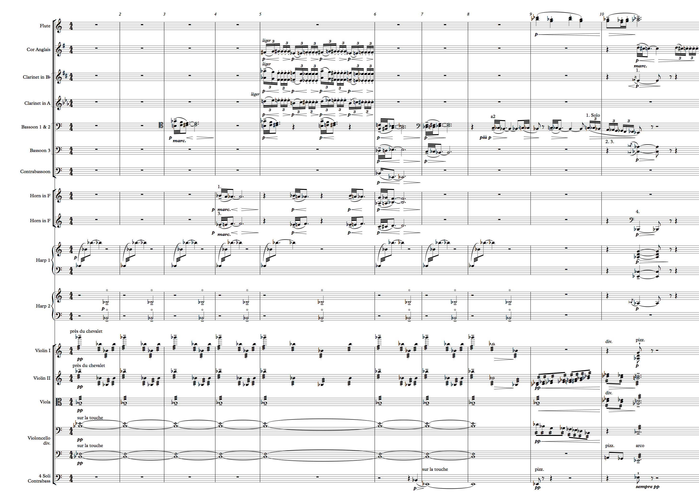 To this blend of sounds, the first and second violins each have three octaves of B-flat tremolos (quarter notes, descending and ascending in each bar), while the violas join the tremolo set on the temporarily lowest sustained pitch in the piece: small B-flat, just below middle C.