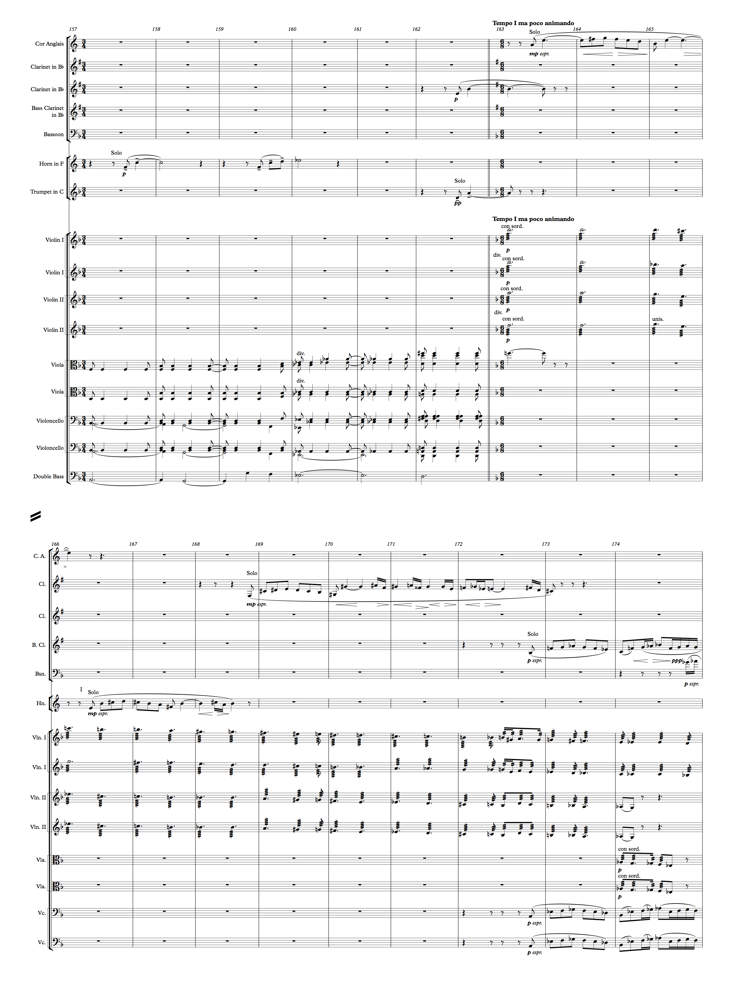 This entire backdrop continues through an English horn solo, a horn solo, a clarinet solo and eventually to a line in the cellos with bass clarinet added at measure 173. If you’re familiar with this work, you’ll note that this descending, somewhat chromatic chordal line is used earlier in the work. In this example, he reprises it to useful effect behind the wind solos