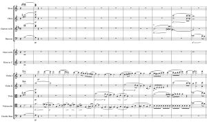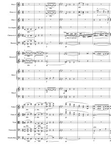 There’s a short passage towards the very beginning of this endearing piece that has the oboe and bassoon playing two lines that are nearly inversions of one another, about an octave apart. The musical space between them is filled only with clarinet eighth-notes in thirds. The other sounds are from just the double basses sustaining whole notes and the harp assisting and adding a touch of a beat to support the clarinets. As the passage comes to an end, the winds open the harmonies up, the horns take over the clarinet eight-notes for one measure before adding to the wind ensemble and filling out the chords.
