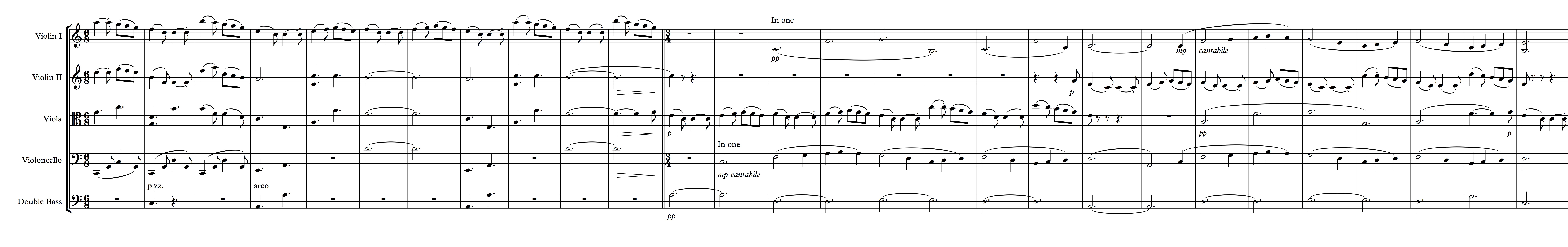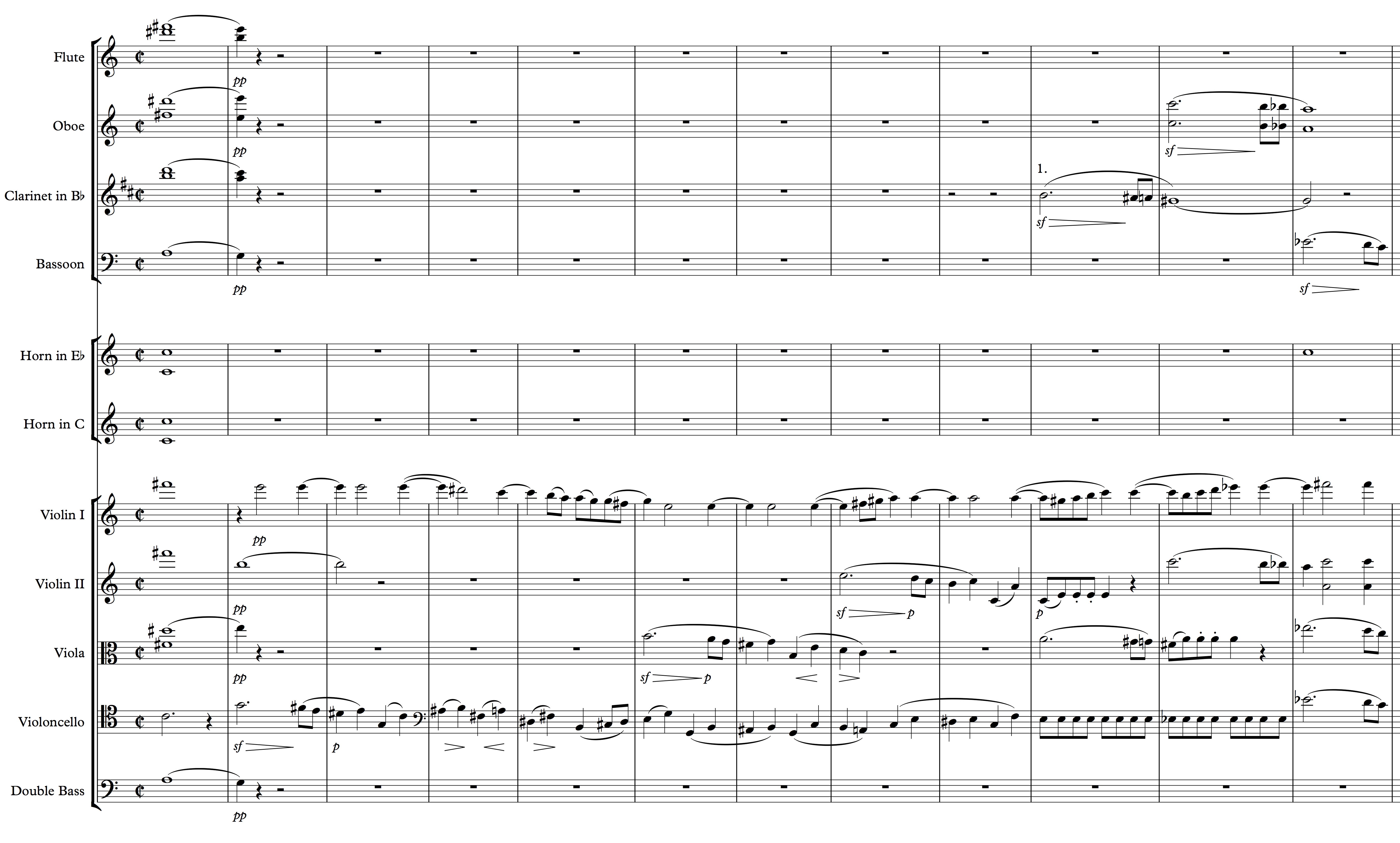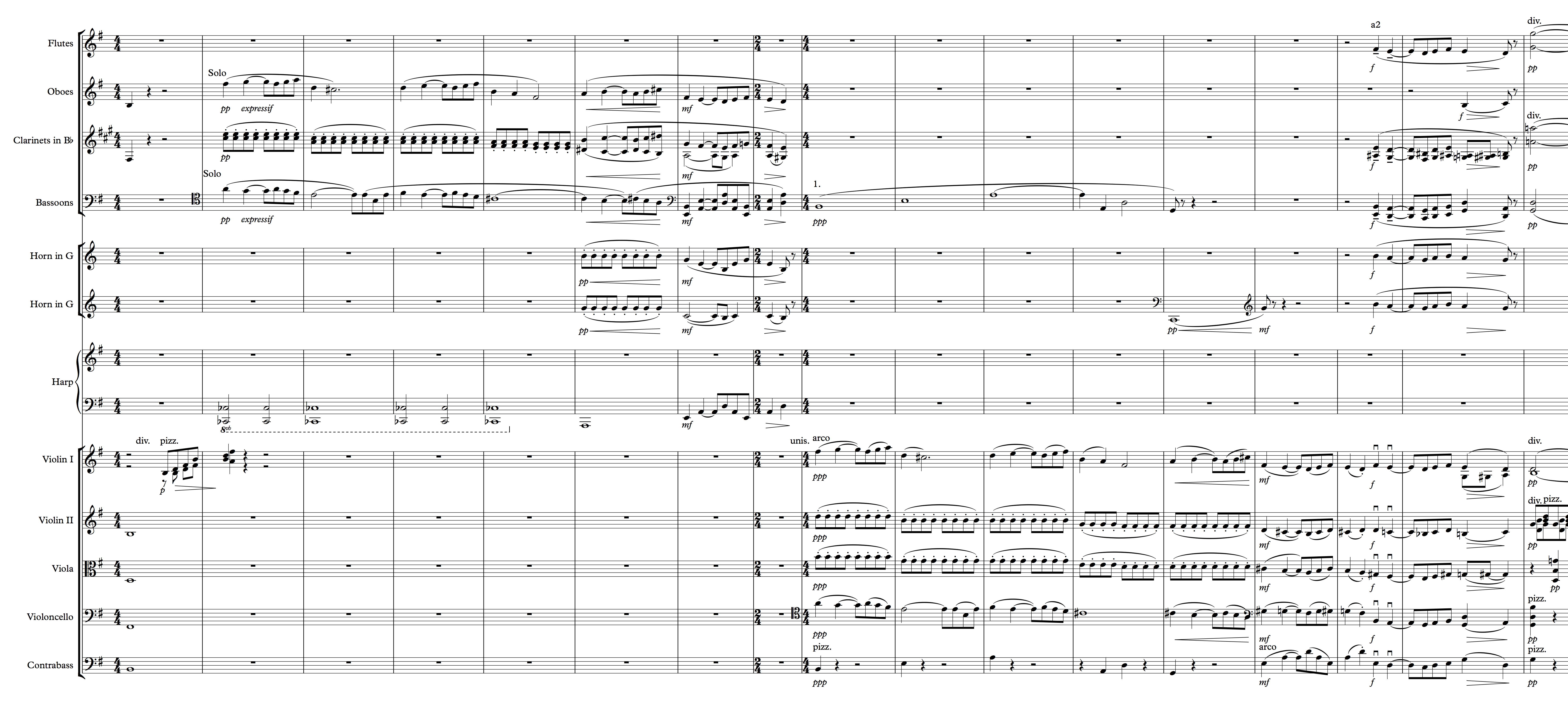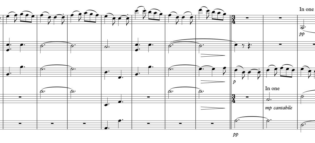 There’s a short passage towards the very beginning of this endearing piece that has the oboe and bassoon playing two lines that are nearly inversions of one another, about an octave apart. The musical space between them is filled only with clarinet eighth-notes in thirds. The other sounds are from just the double basses sustaining whole notes and the harp assisting and adding a touch of a beat to support the clarinets. As the passage comes to an end, the winds open the harmonies up, the horns take over the clarinet eight-notes for one measure before adding to the wind ensemble and filling out the chords.