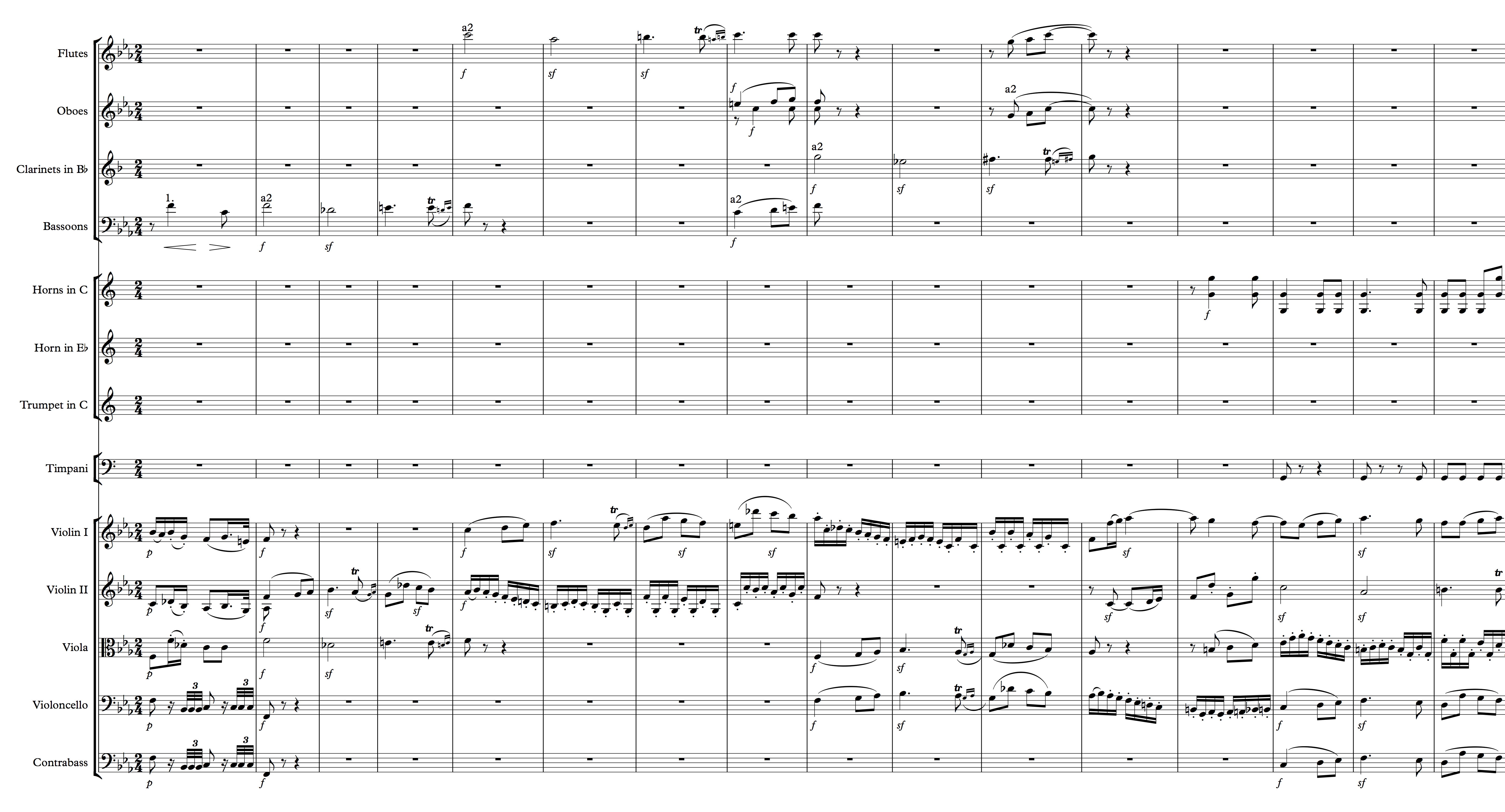Beethoven begins both melodies on the same note. The second violins play the more intricate one while the violas and bassoons play the more sustained one. Beethoven’s use of the violin’s tune, rising step wise from F to G to A-flat, immediately makes the listener know that something “different” is happening. When the F moves down to a D-flat in the second bar as the rising violas arrive at their B-flat, the ear realizes that there are two melodies being played concurrently. With nothing else happening in the rest of the orchestra for these opening three bars, it’s quite simple to keep the two voices straight. When the second violin’s theme is “answered” in bar four, up a fifth, as the flutes take over the second theme from the violas and bassoons, the fugue becomes more interesting tonally. Yet, with all the activity, there’s no problem for the listener following the voices.