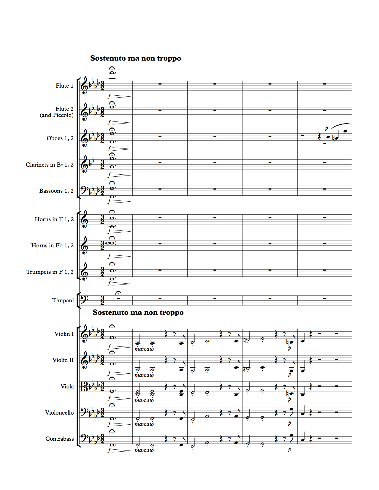 Careful readers may see that the notes in the clarinet, horn, and trumpet parts are not Fs. Because these are “transposing” instruments and traditional scores are written as “transposing” scores, the note these performers play and the note they sound are different. More about this will be explained in a later post.