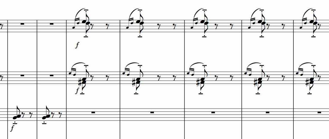 The most obvious is the appoggiatura in the first and third horn parts. Note that the chords themselves are clusters, similar to other effects in the piece (G major chords with an added A). What makes the ear notice them are the bidirectional appoggiaturas. The first horn’s notes are (in concert) D and G to A. The third horn plays A and G to D, the same notes, but in retrograde. The effect is that the audience hears a messy burst of sound on the downbeat so that the exact line between “not yet the downbeat” and “the downbeat” is blurred.