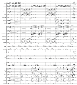 Adding to this feeling are the upper string pizzicatos. Each of the violins plays a two-note chord while the violas play a three-note chord. By the very nature of a string instrument playing multiple notes pizzicato the strings will each sound at slightly different milliseconds. Doing this with thirty or forty performers will understandably have a “messy” attack.