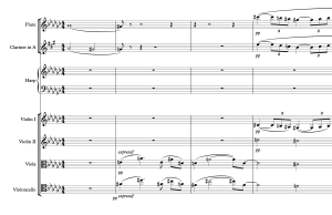 The melody is played in octaves by the flute and the viola, a relatively rare pairing. The violins have triplets that provide some background movement. It’s the harp, though, the soloist, that echoes the same “chords” in quintuplets as the other strings but who also supports the melody. If you examine the notes played on the downbeats (as harmonics) in the harp, you’ll see that they mostly play the same note that the viola is playing. One last feature about the harp part is the irregularity of five notes on one beat. This adds rhythmic excitement to the harmonically somewhat static passage.