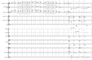 When the melody is presented for the last time it’s back in duple meter. The strings have big grace notes that are indicated in a score note to be played on the beat. Again, we see that the antiphonal beats are played by the chimes and harps.