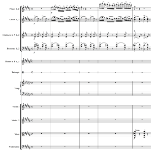 Listen to Example 3 and note how Ravel brings in the flute to play the rapid passages, but leaves the accented quarter note-unaccented eighth notes pattern to the oboe, supported by two clarinets and two bassoons. In fact, it’s not until the fifth measure that we hear anything other than woodwinds when the violas help to accent the first and third measures with pizzicato chords. He adds the second violins in the next measure. The climax builds in the next two measures with the addition of two horns supporting the woodwind chords as well as the addition of the harp and the cellos.