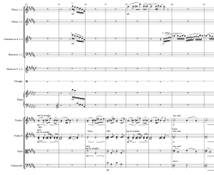 Although many of Ravel’s ideas appear simple and perhaps expected, it would be wise to review the way he scores with so few instruments. Remember this entire movement has no trumpets, no trombones, and no contrabasses. Perhaps the most striking is the use of the triangle in measure 27 – on the pianissimo downbeat accompanying the pizzicato cellos. There are so many other instruments that might be included for a setting with children at play in a park, but Ravel opts to keep it simple, relying on the tuneful source material and understatement of his own work.