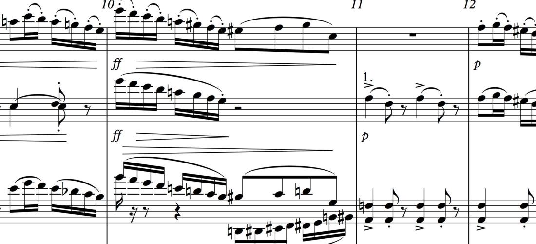 We heard the opening Promenade a few weeks ago. It’s a bold statement of someone walking around an exhibition of paintings. The first painting was called Gnomus and was fast, disjointed, raucous and a little scary. The second Promenade returned us to moving between paintings and was much shorter than the first. This third Promenade is just eight bars. It introduces a bit of mystery into the walk to the next painting with its contrapuntal writing and uncertain tonal center.